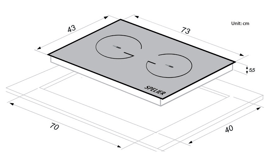 | • Điện áp 220-240V/ 50-60 Hz • Kích thước bếp (D x R x C): 73 x 43 x 5,5 cm • Kích thước khoét đá (D x R): 70 x 40 cm ![]() |