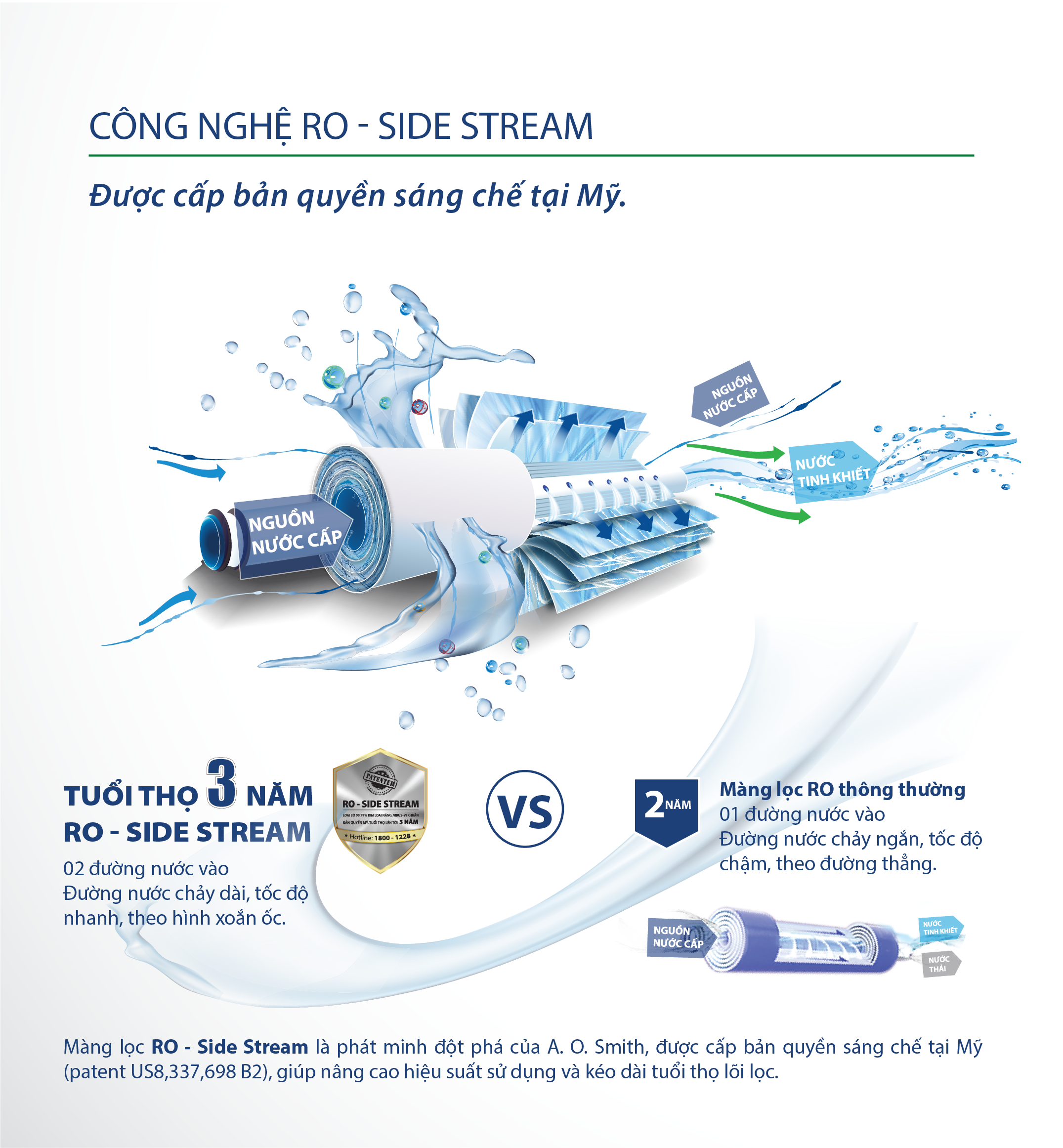 CÔNG NGHỆ RO – SIDE STREAM: được cấp bản quyền sáng chế tại Mỹ, giúp nâng cao hiệu suất và kéo dài tuổi thọ lõi lọc.