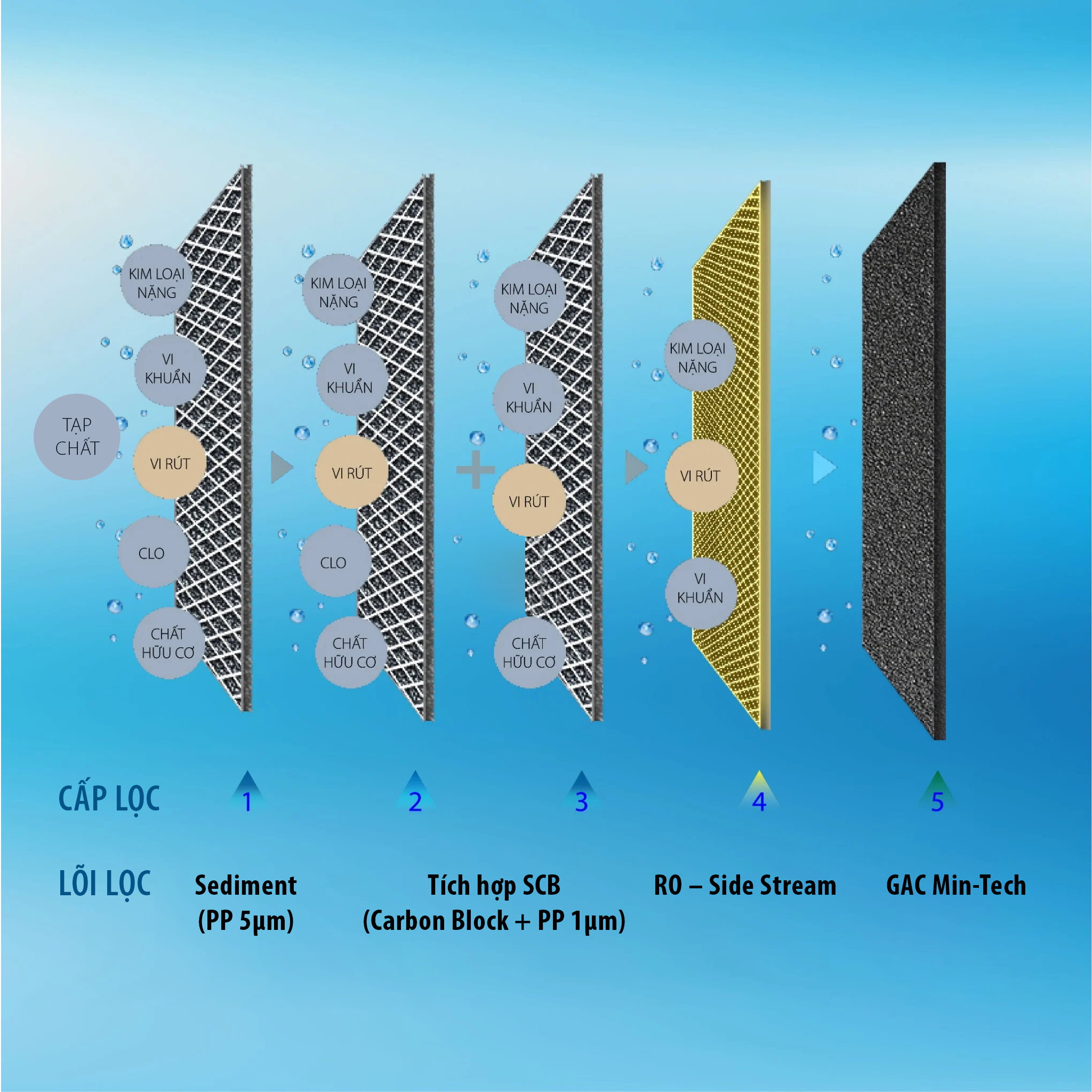 Lõi lọc GAC Min-Tech: khử mùi, điều chỉnh vị và bổ sung khoáng chất thiết yếu cho nước, đảm bảo nước có vị tươi, tự nhiên và có độ pH cân bằng.